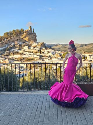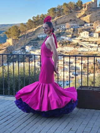 Precioso vestido de flamenca, ideal para lucir en cualquier evento. Es de color fucsia y morado, con una falda amplia y elegante. - Diseño favorecedor que realza la figura. - Confección de alta calidad. - Perfecto estado.