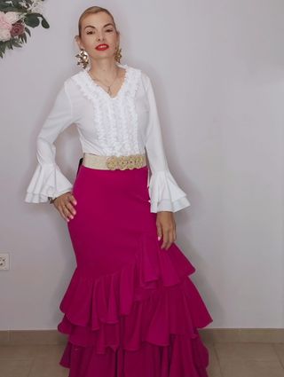 Precioso traje de flamenca de color rosa, compuesto por dos piezas: falda y top. La falda es de vuelo, con varias capas de volantes que le dan un aspecto elegante y favorecedor. El top es sencillo y combina perfectamente con la falda. Ideal para cualquier evento flamenco. - Falda con volantes. - Top a juego. - Talla única.