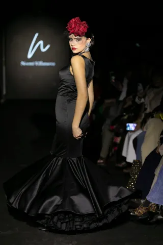 Vestido de flamenca de color blanco, con un diseño elegante y voluminoso. - Mangas abullonadas con detalle plisado. - Falda con volantes en cascada. - Adornado con flores en la cabeza.