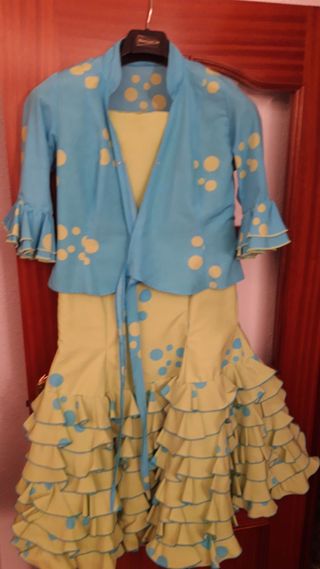 Precioso vestido de flamenca, ideal para lucir en cualquier evento. - Es de color amarillo. - Tiene mangas acampanadas. - Presenta varias volantes en la falda. esta hecho a mano por modista. No hago envíos solo entrego en mano en Jaén capital.