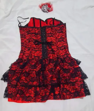 Vestido de estilo gótico con un diseño llamativo en rojo y negro. Presenta un corsé ajustado y una falda con volantes. - Detalle de encaje negro sobre base roja. - Corsé con cordones negros. - Falda con tres capas de volantes. - Adorno floral en la parte superior.