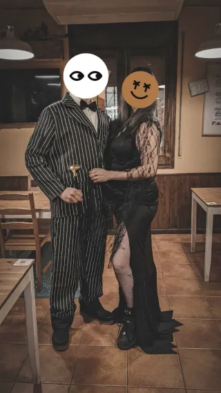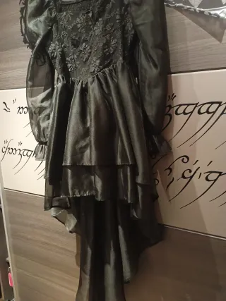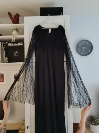 Disfraz Morticia Addams - Diseño elegante y gótico. - Mangas de encaje detalladas. - Falda larga con abertura. Usado 2 veces. También disponible disfraz de Gómez Addams.