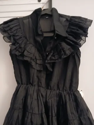 Vestido Miércoles . Vestido negro gótico o un vestido casual con volantes, que a menudo se vende como un disfraz de Miércoles Addams. El estilo presenta un cuello camisero, volantes en las mangas y capas de tela en la falda.