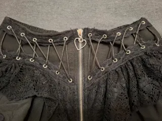 Falda de estilo gótico con detalles únicos. - Diseño asimétrico con cremallera. - Costuras decorativas en contraste. - Doble capa con cinta y encaje en el bajo.