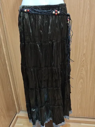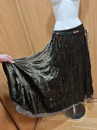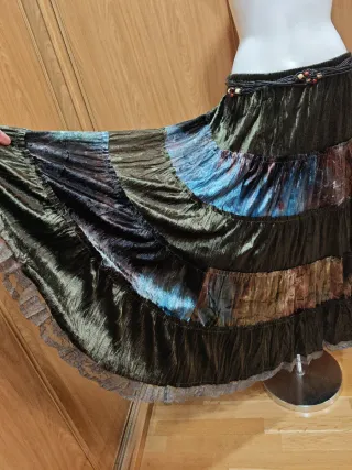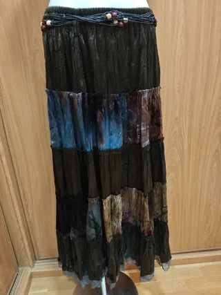 Maxi falda estilo Bohemio/Gótico en talla única en color predominante verde oscuro y multicolor en tela suave y brillante (poliéster) con bajo en encaje. Nuevo sin etiqueta.