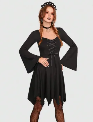 Vestido de estilo gótico con un diseño llamativo. - Cuerpo con escote corazón. - Corsé frontal con cordones. - Mangas acampanadas con encaje. - Detalle de encaje en la falda.