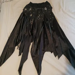 Falda con un diseño único estilo gótico y new wave. Presenta detalles llamativos que la hacen destacar. - Adornada con ojales metálicos y anillas. - Incorpora tiras de cuero o material similar. - Diseño asimétrico con cortes irregulares.