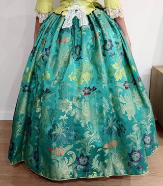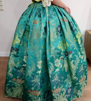 Falda de fallera color verde con flores en naranja, verde pistacho, morado, azul, granate e hilo en dorado. En muy buen estado. Largo: 107 cm aprox (en la foto la persona mide 1.60cm) Cintura: máximo unos 80 cm Está toda la tela sacada. Puede usarse con el justillo huertana niña (otra publicación y última foto) entrando la falda y ajustándola para niña! No contiene manteleta pero tengo una en venta en otra publicación!
