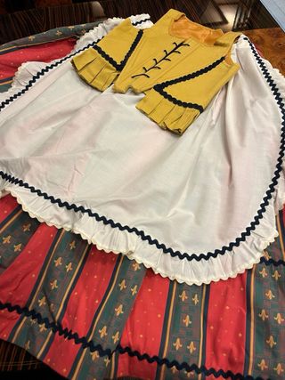 Vendo traje huertana de niña, mas o menos de 9 - 10 años de edad. Las medidas del corpiño es 35 cm. La falda de cintura 27 y de larga entre 85-90cm. Se podria sacar un poco de largo y cintura