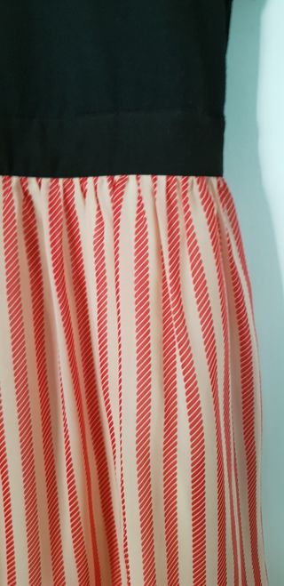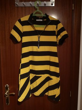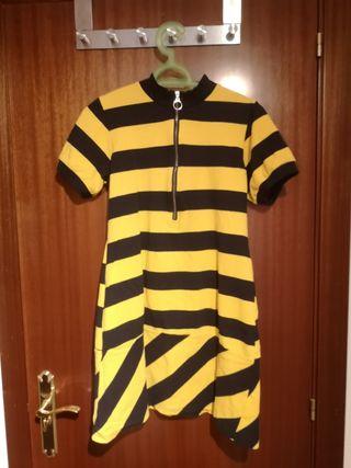Vestido Kling. Rayas negras y amarillas. Miniskirt. Manga corta y cremallera delantera. Falda con las rayas al bies. Muy original, usado pocas veces.