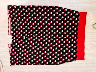 Falda corta, por encima de la rodilla, con estampado geométrico en blanco y negro. - Diseño con pliegues en la parte delantera y trasera. - Cintura alta. - Tejido con textura. - Con forro Es gordita y abriga. Talla 2 que corresponde como una S. Cintura 72 cm. Prácticamente nueva. Muy poco usada porque me quedó pequeña.