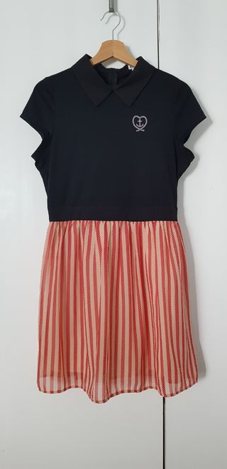Vestido corto de la marca Kling. Talla 2 de Kling (daría para una talla XS-M ya que es amplio y la cintura es muy elástica). Puesto en un par de ocasiones. Perfecto para graduación o eventos de día. - Diseño tricolor en azul marino, coral y blanco. - Corte a la cintura que realza la figura. - Falda acampanada que le da un toque femenino. - Escote redondo y mangas cortas.
