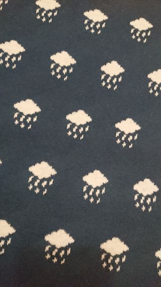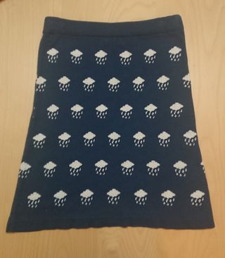 Falda midi de tejido de punto elástico con motivo de nubes lloviendo lluvia. Fondo azul marino con nubes de color blanco. Talla S. Kling. 100% algodón. Usada en una ocasión. Precio 5 Eur o de regalo si compras algo más de lo que tengo a la venta por valor igual o superior. Cualquier duda, consúltame.