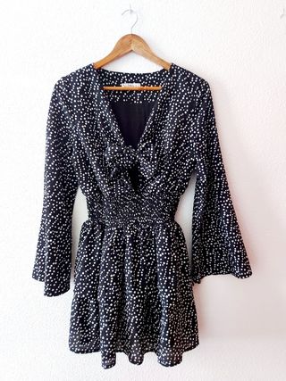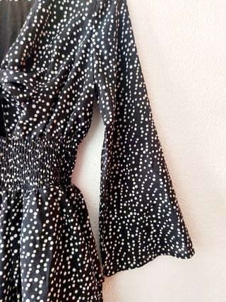 Vestido de Kling, talla 3 o M de Kling. Negro con lunares blancos. Se anuda en la parte frontal, para ajustarlo al pecho, y queda una pequeña abertura bajo el nudo.La falda está compuesta por dos volantes. Cintura elástica y fruncida. Forrado por dentro