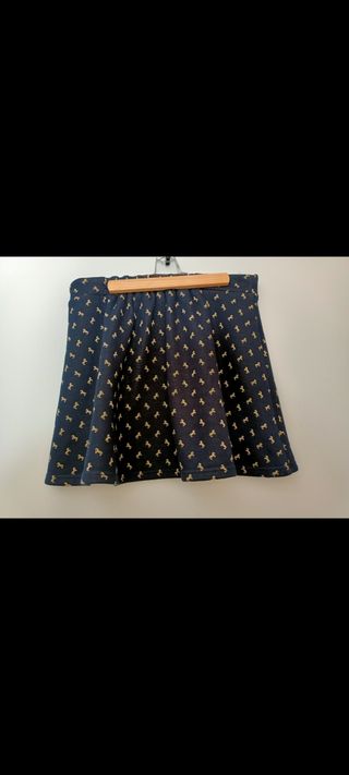 Falda corta tipo skate con un divertido estampado de caballos en color azul sobre fondo azul marino. El diseño es alegre y llamativo. Tiene goma en la parte de atrás. Forro marrón y tacto suave tipo terciopelo. Talla L. Kling. Cintura 42, largo 43 aprox🍁❄️