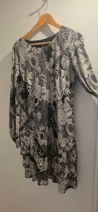 Elegante vestido midi/largo de la marca Mango con un llamativo estampado de cebra (zebra) en blanco y negro. Talla: M (38). Diseño: Destaca por su estampado "animal print" de cebra,. Corte: Cuenta con escote en pico (V) que estiliza la zona del cuello y mangas largas ligeramente holgadas (estilo murciélago o fluido) que le dan un aire muy sofisticado. Cintura: Tiene un corte en la cintura (fruncido o elástico) que define la silueta sin apretar, pero también tiene una cinta/correa de tela para ajustar. creando una caída de la falda muy bonita y con movimiento. Tejido: Tela ligera, fresca y con mucha caída. Perfecta para entreti
