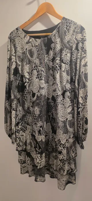 Elegante vestido con estampado paisley en blanco y negro. Presenta un diseño con volantes en la parte inferior y mangas largas. - Diseño de cachemir. - Mangas largas abullonadas. - Falda con volantes en cascada.