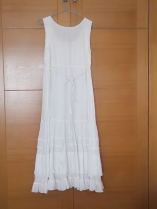 Vestido blanco con un diseño de volantes. Largo 83cm aprox. - Escote en V. - Tirantes anchos. - Cuerpo con ballenas. - Falda escalonada.