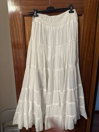 Falda larga blanca con varios volantes, ideal para un look fresco y veraniego. - Diseño de capas con volantes. - Cintura elástica para mayor comodidad. Pick up Sol or La Latina Metro
