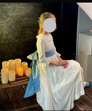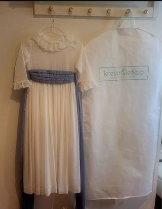 Vestido de comunión de la marca Teresa & Leticia. Un diseño elegante y especial. - Cuerpo blanco con cuello y mangas de volantes. - Fajín azul o rosa polvo a juego. - Falda larga y vaporosa.