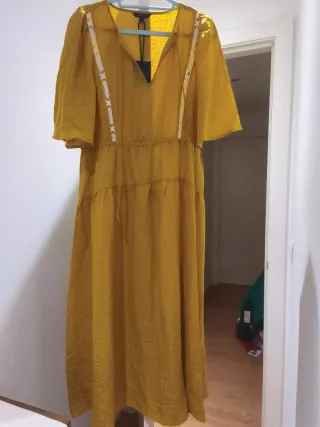 Vestido largo de Cortefiel en color mostaza, talla L. Es una prenda nueva con etiqueta. - Diseño con detalles de encaje blanco en el escote. - Mangas cortas abullonadas. - Corte escalonado en la falda.