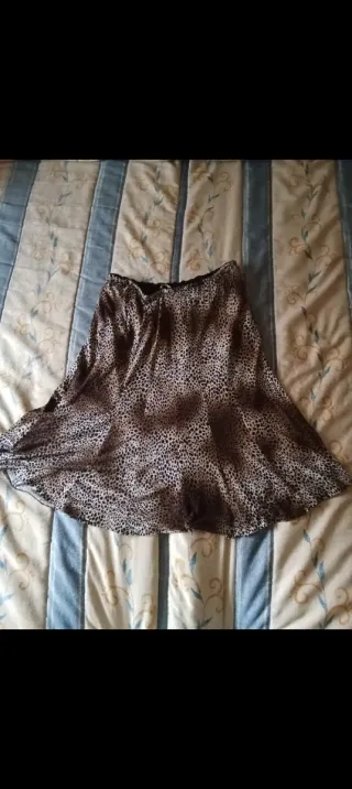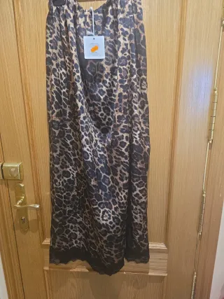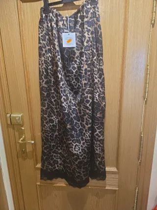 Falda larga de satén con estampado de leopardo. - Diseño elegante y llamativo. - Tejido satinado con caída. - Cintura elástica para mayor comodidad.