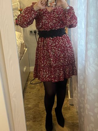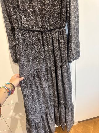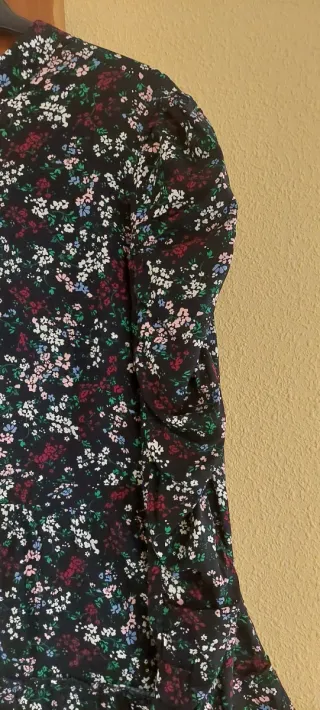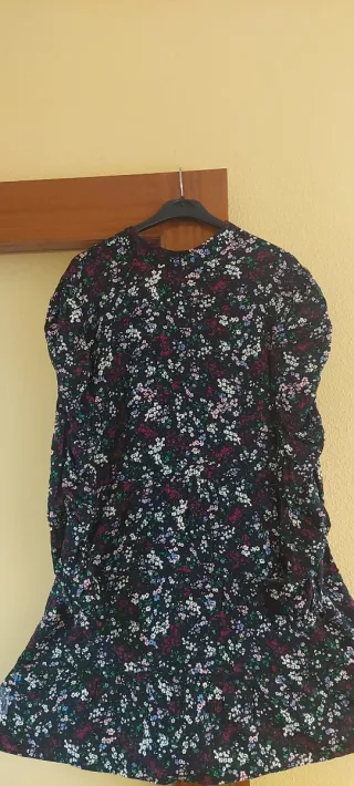 Vestido negro con estampado floral y manga larga abullonada, tiene dos costuras y una de ellas se frunce todo a lo largo. Cuello cerrado y cremallera invisible en la espalda. La falda consta de tres volantes. Mide 53 cm de axila a axila, 45 de cintura y 90 de largo. Talla 42-44. Muy poco uso.