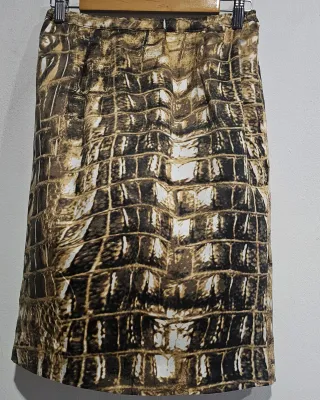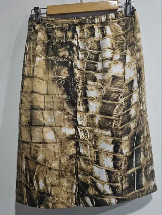 Falda con un llamativo estampado que imita la textura de la piel de cocodrilo. - Diseño único y original. - Tonos marrones y beige. - Abertura lateral con cremallera escondida. - Cintura elástica. - Con forro. Cintura 34 cm, largo 60 cm