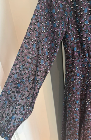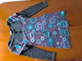 Vestido con mangas largas y un estampado circular en tonos morados y azules. - Diseño con cuerpo gris y falda estampada.