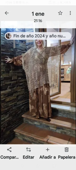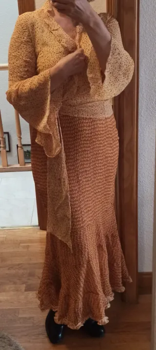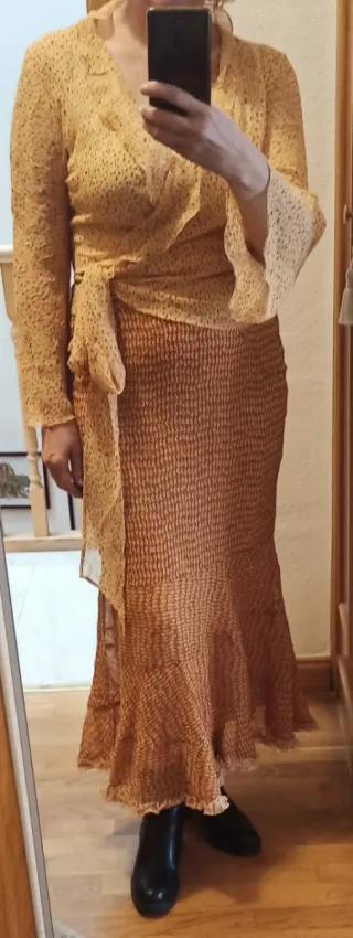 Conjunto de falda y blusa con un bonito estampado a contraste. Llevan los colores al revés en cuanto a fondo y motivo. Es de tela de gasa rizada, como arrugada. Muchas caída, no sé arruga nada. Es de una diseñadora local. - Blusa cruzada con mangas acampanadas, volante en el cuello y lazada grande que cruza por detrás.Pone talla 40, pero para poco pecho. - Falda larga con volante en tres piezas en el bajo, terminado en un volantito como los colores de la blusa a contraste. Es bastante larga. Pone talla 42, pero es la que yo tengo y he está pequeña , es nejor para 38 o 40. Yo me lo he puesto aunque me queda pequeño para que se vea