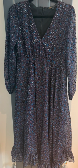 Elegante vestido largo de Ted Baker con un estampado floral sobre fondo negro. Ideal para ocasiones especiales. Talla 2 una S- M - Diseño de manga larga. - Escote alto. - Falda fluida con transparencia.