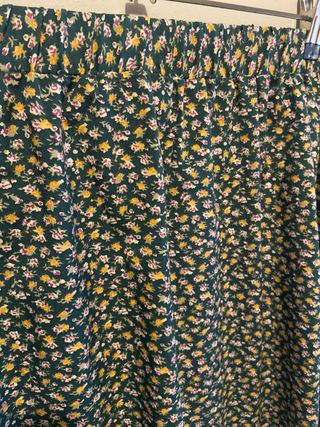 Falda larga con un bonito estampado floral sobre fondo verde. - Diseño con flores pequeñas en tonos amarillos y blancos. - Cintura elástica para mayor comodidad. - Corte fluido y ligero.
