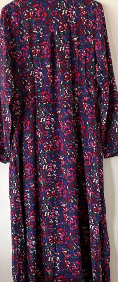 Elegante vestido largo con un estampado floral vibrante. Presenta un diseño con volantes y mangas largas. - Estampado floral multicolor sobre fondo azul marino. - Mangas largas abullonadas. - Diseño con volantes en la falda. - Cintura elástica para un ajuste cómodo.talla ML