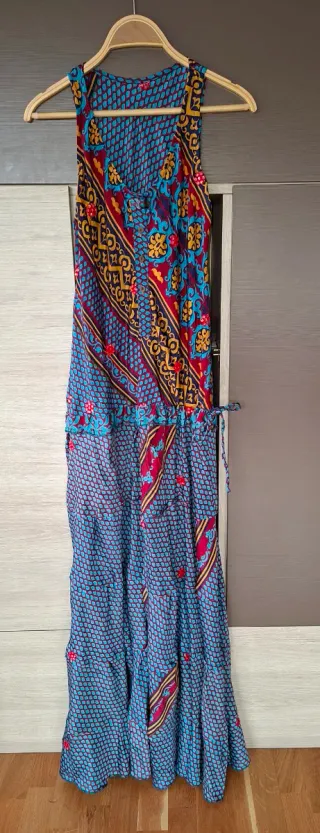 Vestido largo con un estampado vibrante y llamativo. Su diseño es ideal para lucir un estilo bohemio y relajado. - Diseño sin mangas. - Cintura elástica con cordón ajustable. - Falda con varios volantes.