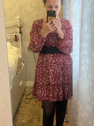 Vestido alegre con estampado floral, ideal para el invierno. Presenta un diseño con cinturón negro. - Mangas largas abullonadas. - Escote en V. - Falda con volantes.