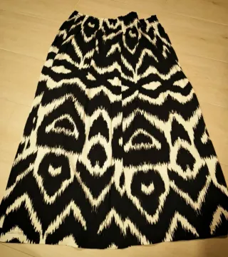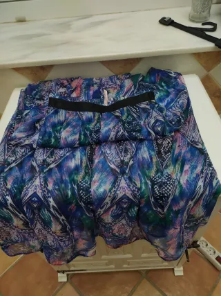 Falda TALLA 44, con un estampado llamativo. Cremallera, quillas, FORRO poliamida. Exterior poliester, viscosa y elastano. Lavable y muy combinable. Cintura 37x2, largo 81, ancho abajo 1.08x2 SOLO EFECTIVO