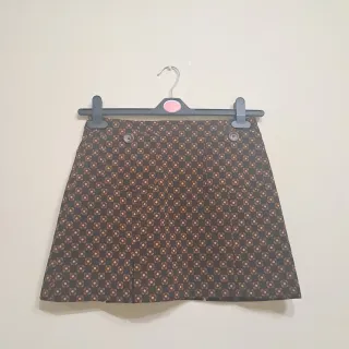 Minifalda con un bonito estampado floral en tonos marrones y anaranjados. Presenta dos botones decorativos en la parte delantera. Medidas: cintura 35 largo 36 - Diseño con estampado geométrico. - Cierre con botones.