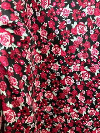 Falda con un llamativo estampado de rosas rojas sobre fondo negro. - Diseño floral vibrante. - Talle alto. - Tejido elástico para mayor comodidad. - Superiores trasera y cremallera - Medidas: 90 cm cintura, 56cm de largo