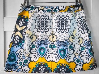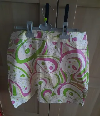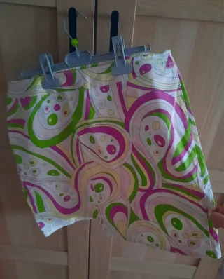 Falda con un llamativo estampado abstracto. No tiene forro Medidas: Cintura: 42 cm Cadera:52 cm Largo: 44 cm - Diseño con formas orgánicas y círculos. - Combinación vibrante de colores.