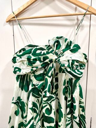 Precioso vestido estampado verde, puede usarse con tirantes finos o palabra de honor, tiene sujeción interior para el pecho (se ve en las fotos) Cremallera lateral y lazada que hace una bonita forma en el pecho, el lazo está cosido y se mantiene en su lugar. El vuelo de la falda sale bajo el pecho y la falda es más larga por detrás que por delante. Está totalmente forrado y tiene mucho vuelo y movimiento. #vestidovuelo #palabradehonor #bodasbautizoscomuniones #vestidoestampadoverde #talla40