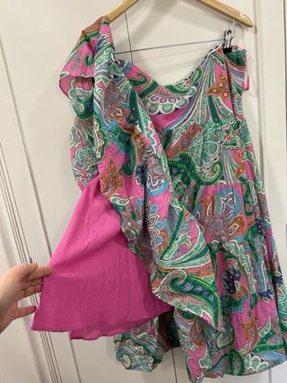 Preciosa falda larga de vuelo con estampado paisley en tonos rosas y verdes. Es una prenda única y vistosa, ideal para cualquier ocasión. Es de tallas grande, aunque marca M sirve para 48/50, goma en la cintura. - Diseño de vuelo con varias capas. - Estampado paisley multicolor. - Tejido ligero y fluido.