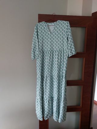 Precioso vestido largo con estampado geométrico en tonos verdes y blancos. Es una prenda bonita y elegante, ideal para cualquier ocasión. - Diseño de cuello en V. - Manga tres cuartos. - Falda con vuelo.