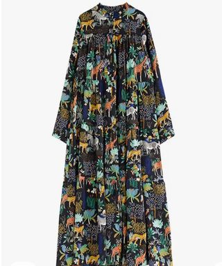 Precioso vestido largo con un estampado de animales muy colorido. Es una prenda única y llamativa, ideal para cualquier ocasión. - Manga larga. - Corte amplio y fluido. - Falda con vuelo.