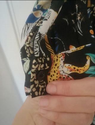 Vestido Kilibbi estampado en verde, rosa palo, negro y beige. El negro es de una textura aterciopelada . Es de manga larga acabada en goma. La parte de arriba es transparente y tiene botones,se ajusta a la cintura con un cordón de la misma tela. La parte de la falda es muy original con un volante que deja la parte delantera más corta y detrás más larga. Medidas largo delantero 1,14 y detrás 1,36 cm. Ancho de hombros 40 cm, axila a axila 48 cm , manga 60 cm y cintura 46 cm . Tienes más vestidos y complementos para hacer bonitos looks en mi perfil así como también objetos decorativos