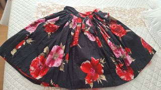 Falda estilo pin up con un llamativo estampado floral. - Diseño con lazada grande en la parte delantera - Tejido ligero y con caída. Forro de tull , medidas cintura y largo últimas fotos ,precio más bajo. No negociable