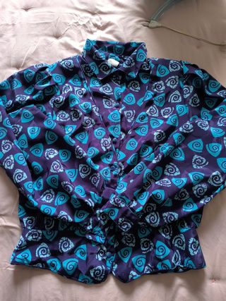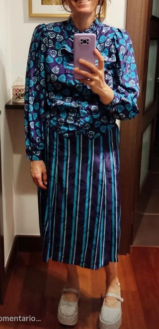 Pecho 48cm Largo desde hombros 56cm Cintura 40cm Cadera 50cm Largo desde cintura 72cm Cuello camisero. Lazo en el cuello. Guatas en hombros. Forro interior. Manga larga. Falda midi. Talla 46 vintage que equivale a una 38, pongo medidas. - Estampado floral en tonos azules y morados. - Falda de rayas verticales. - Mangas abullonadas.