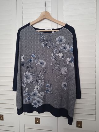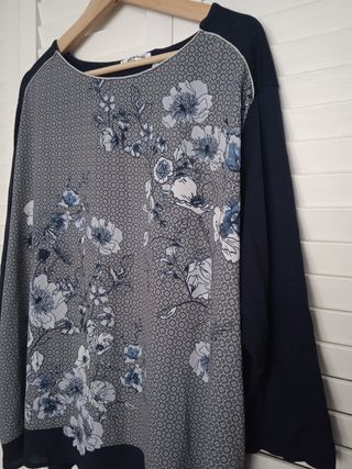 Camiseta elegante y cómoda de la marca Punto Roma, talla XL. Diseño exclusivo con estampado geométrico y floral en la parte frontal, en tonos azul marino y blanco. La parte trasera es lisa en azul marino, sin estampado, lo que le da un toque moderno y versátil. Tiene manga larga y cuello redondo, ideal para entretiempo u otoño/invierno. El tejido es muy suave, con caída fluida, lo que la hace perfecta tanto para looks casuales como un poco más formales. Corte holgado, muy cómodo. Ideal para combinar con jeans, pantalones de vestir o faldas.