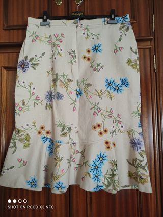 Falda recta ,color negro y blanco con estampado de flores . Medidas : largo de 58 cm , cintura de 48 cm ,talla 46 ,de la marca Alcriscom . Está en muy buen estado.