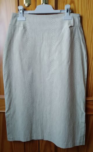 Falda estampado gris claro de serpiente prácticamente nueva. Talla 40. Largo 67cm. Aperturas laterales de 18cm. Tela elástica. Se específica composición del tejido en la etiqueta.