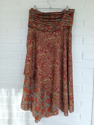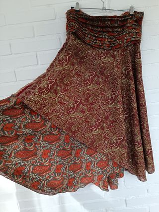 Se vende falda de seda 100% larga con un estampado precioso. Con cintura elástica.